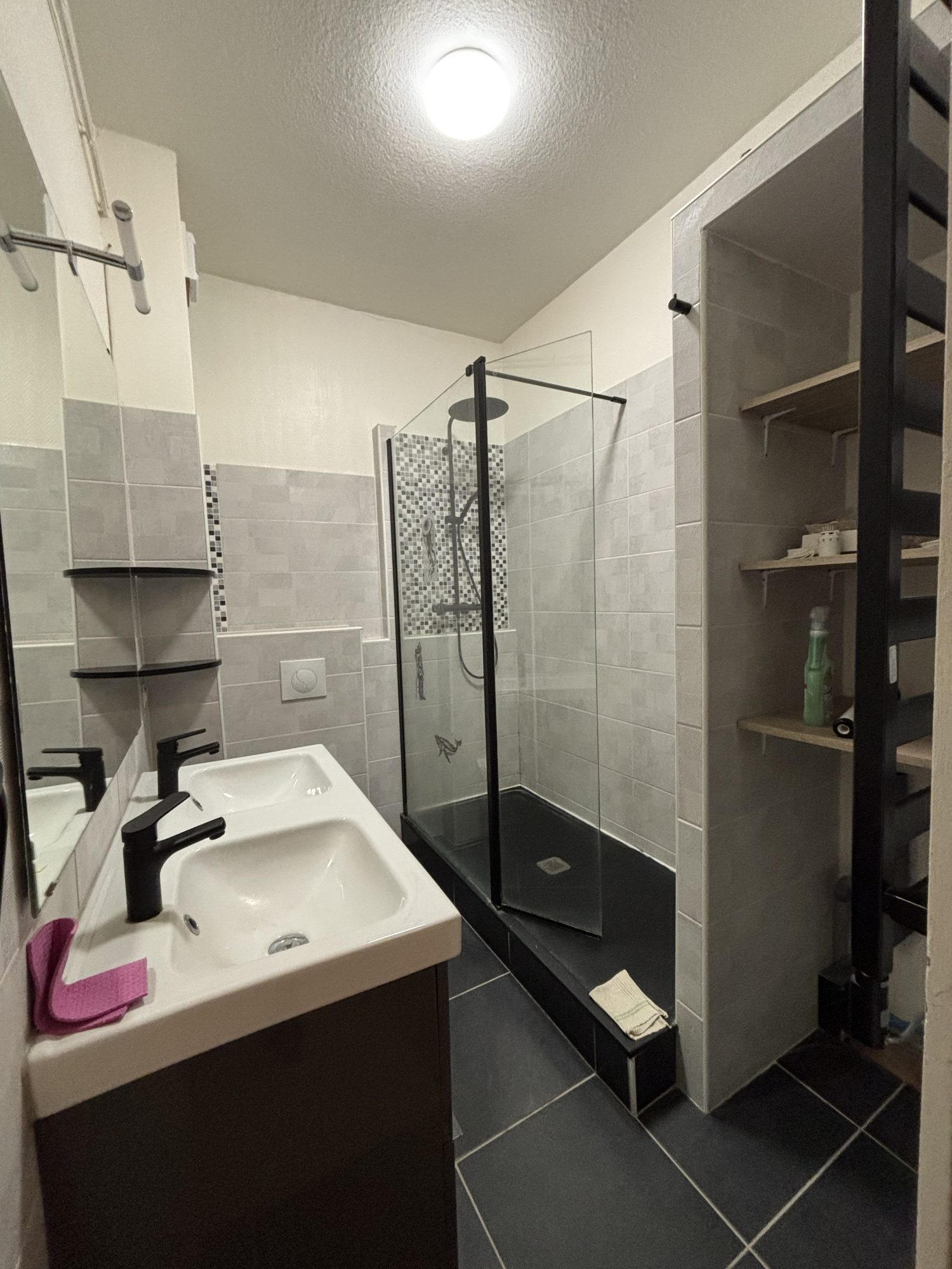 Le premier appartement, actuellement loué, offre une surface d’environ 52 m². Traversant et lumineux, il se compose d’une cuisine équipée avec cellier buanderie, d’un salon, d’une chambre ainsi que d’une salle de bains avec double vasque et WC.