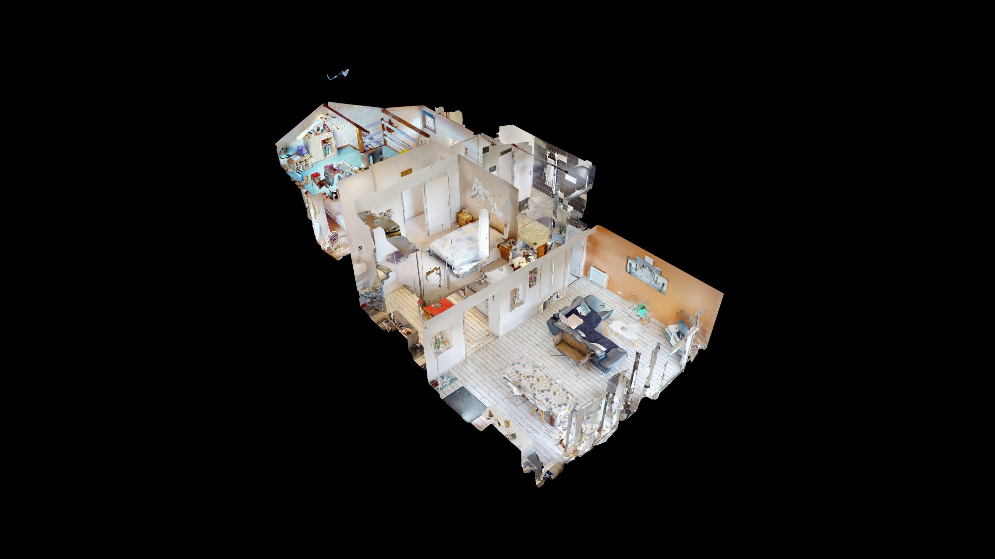 A l'étage : deux chambres dont une avec mezzanine et une salle d'eau avec WC