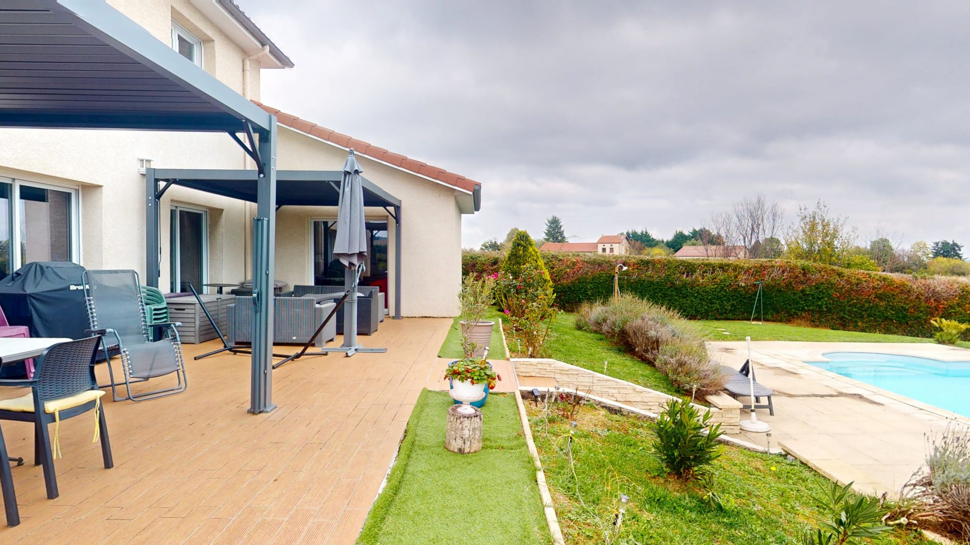 la terrasse est abritée sous 2 pergolas bioclimatiques.