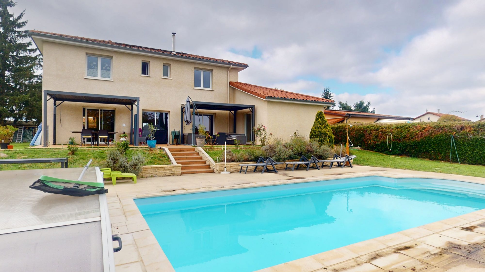 4 grandes baies vitrées donnent accès à une terrasse de 50m² bordant une piscine de 8m x 4m chauffée par une pompe à chaleur.