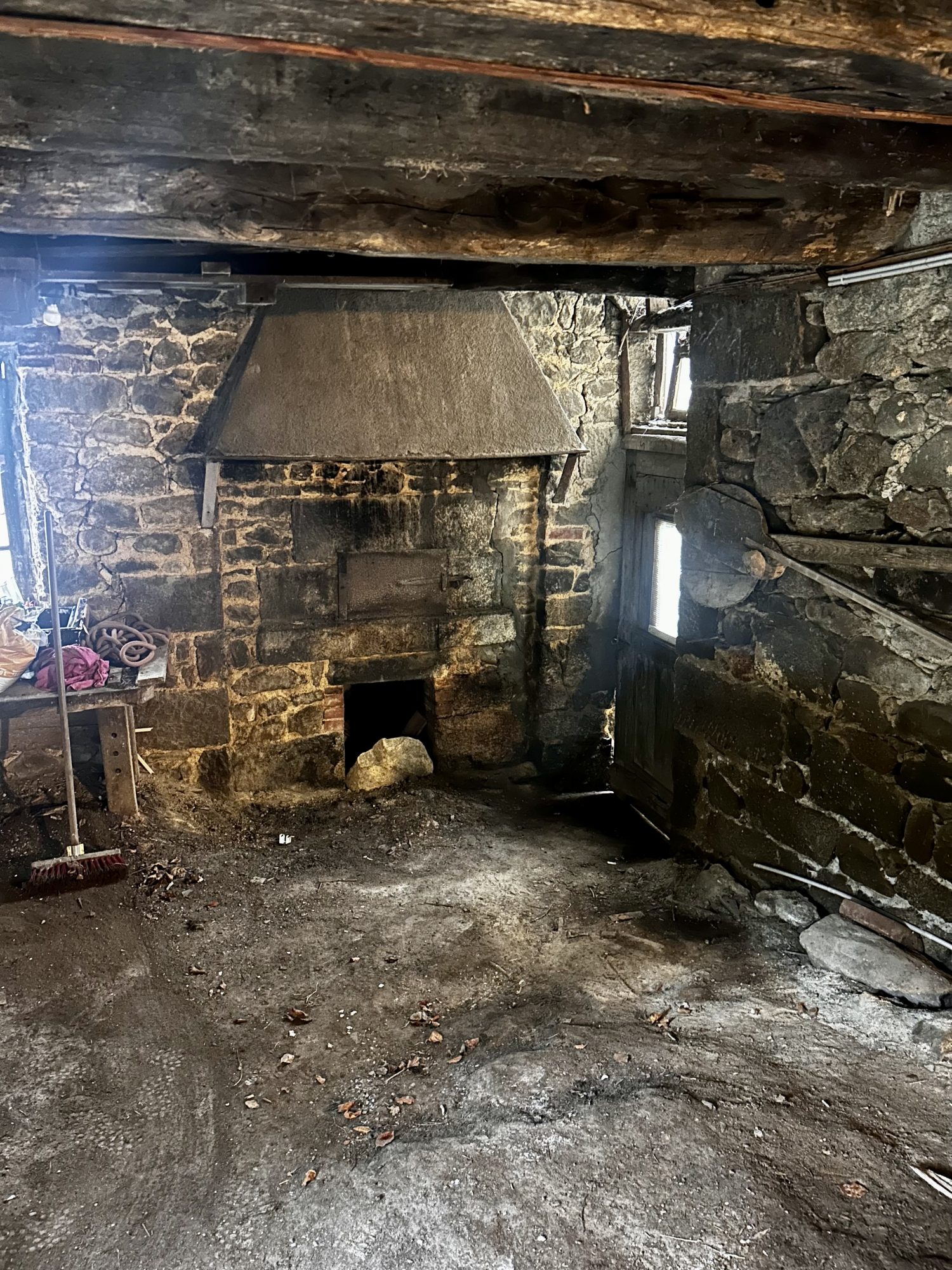 Les deux parties sont réunies par un appentis avec un bac ou coule une source, et un ancien four à pain à rebâtir. Un petit hangar non attenant vient complété l'ensemble.