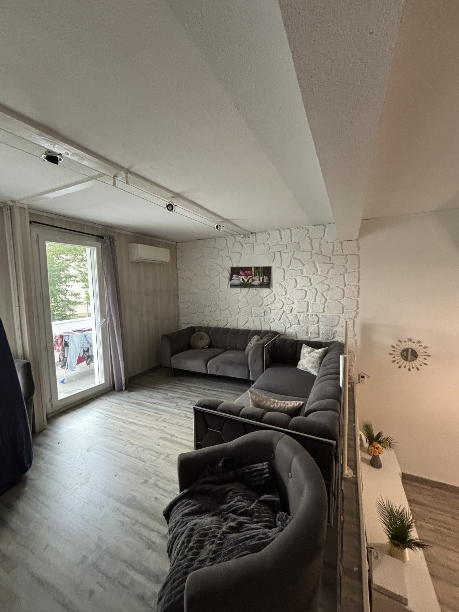 •Étage intermédiaire : salon-séjour lumineux donnant sur un balcon d’environ 12 m².