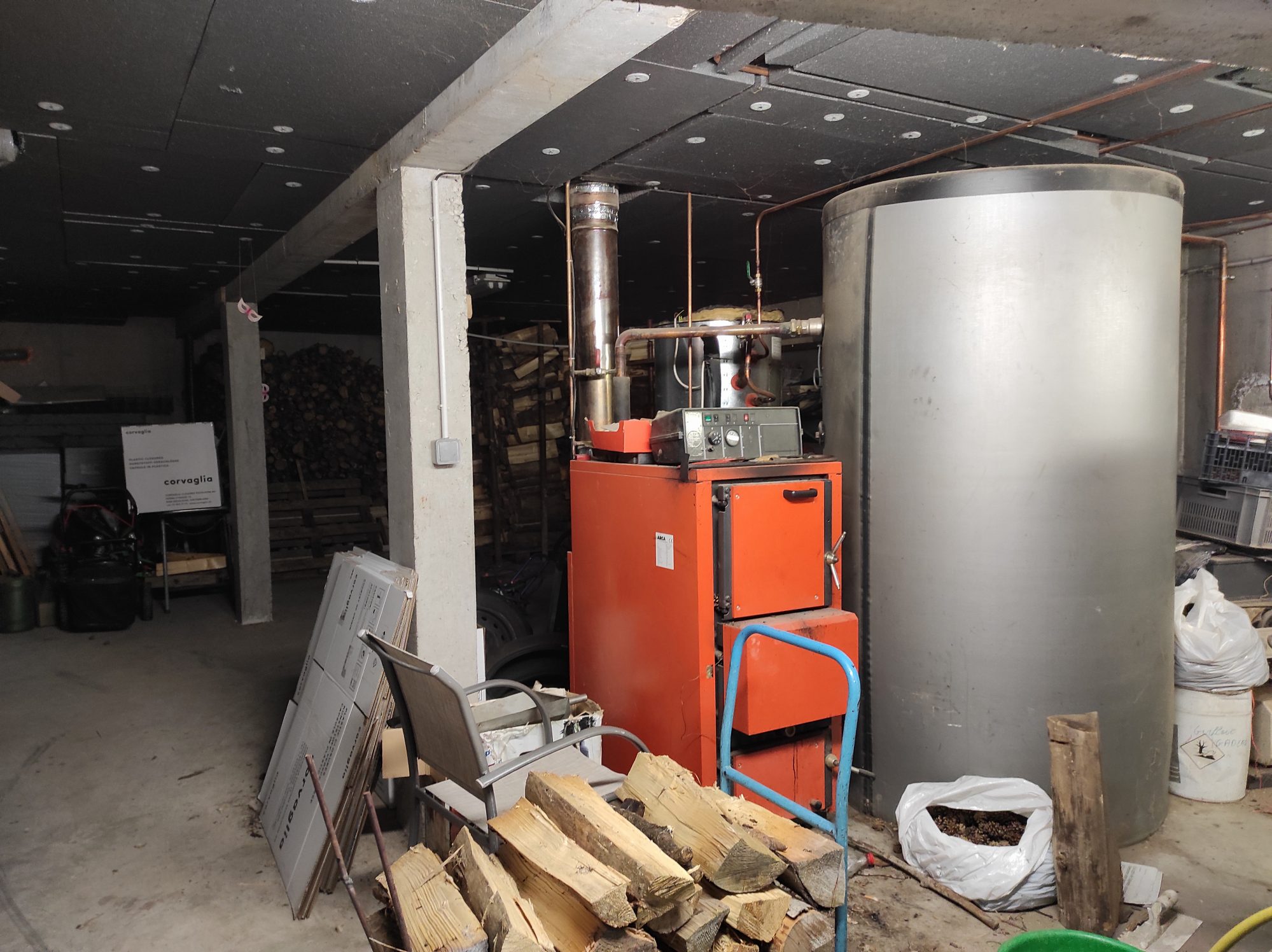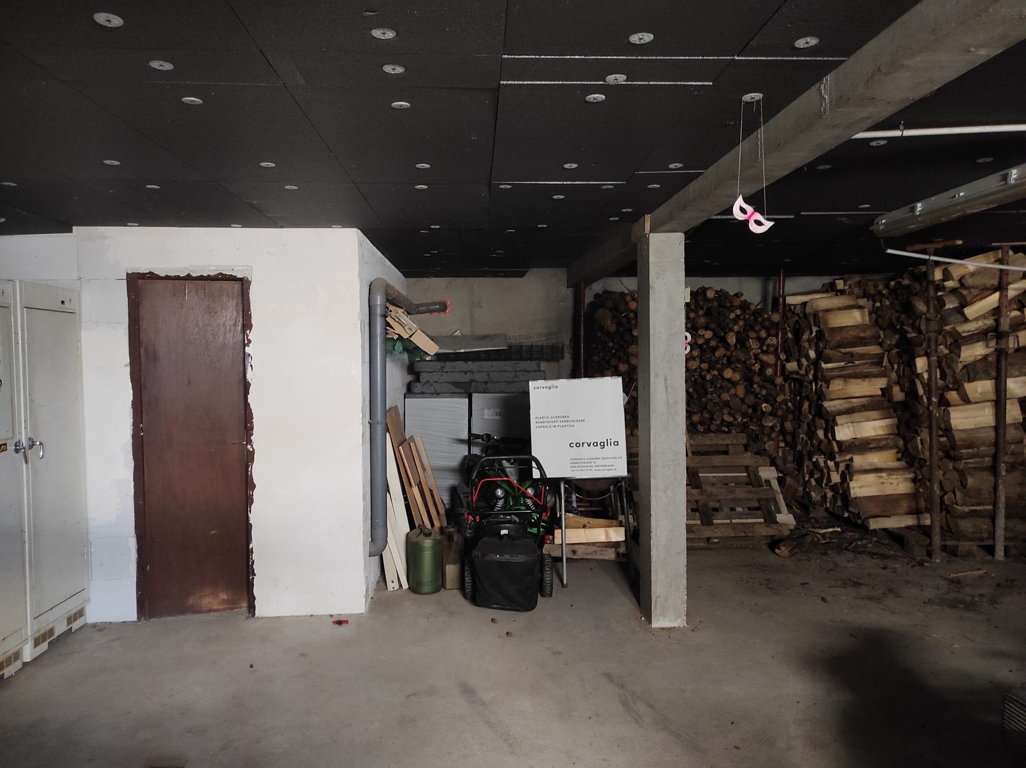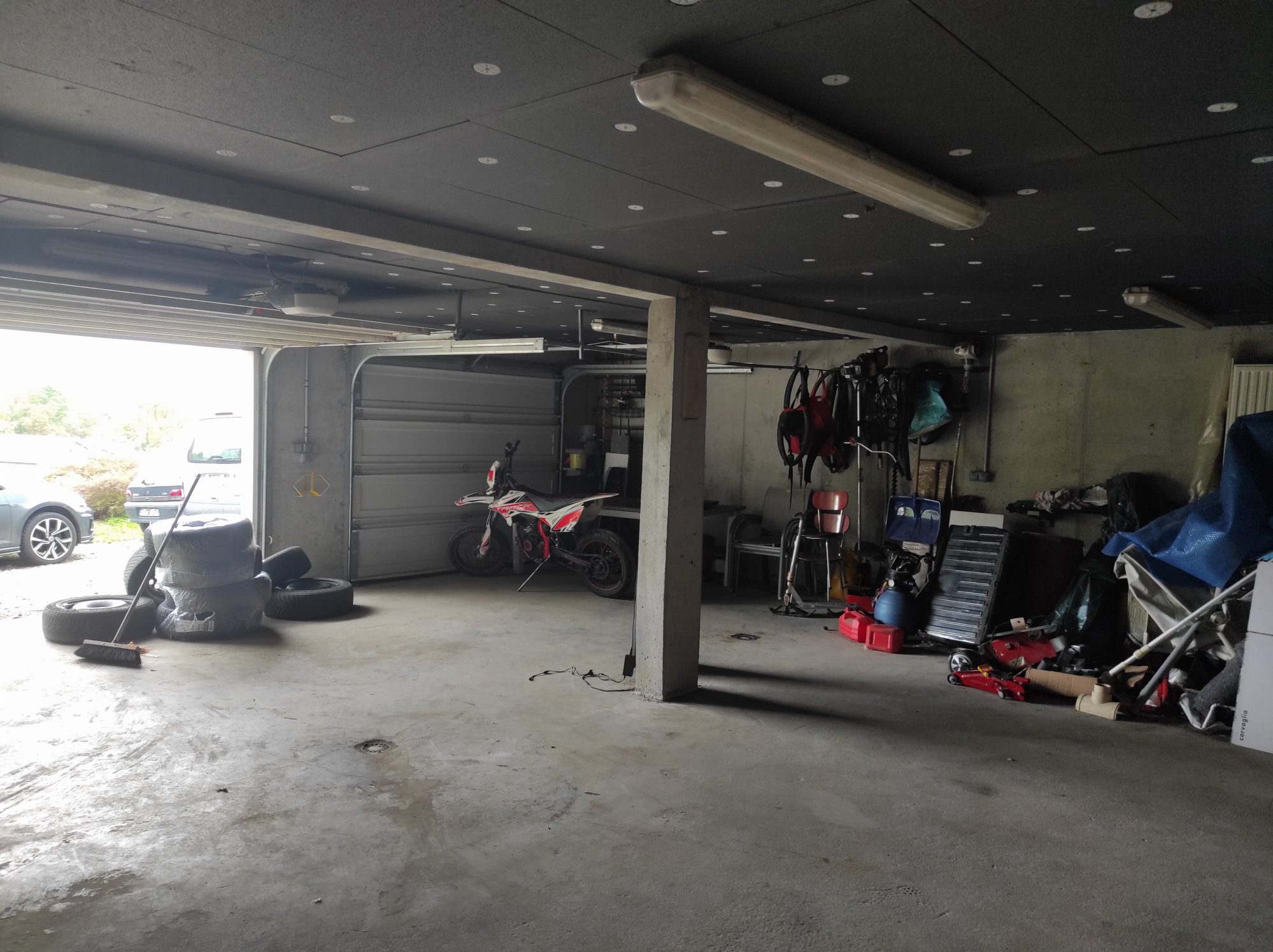 Sous-sol complet d'environ 150 m² avec garage double, espace sanitaires, cave et chaufferie.