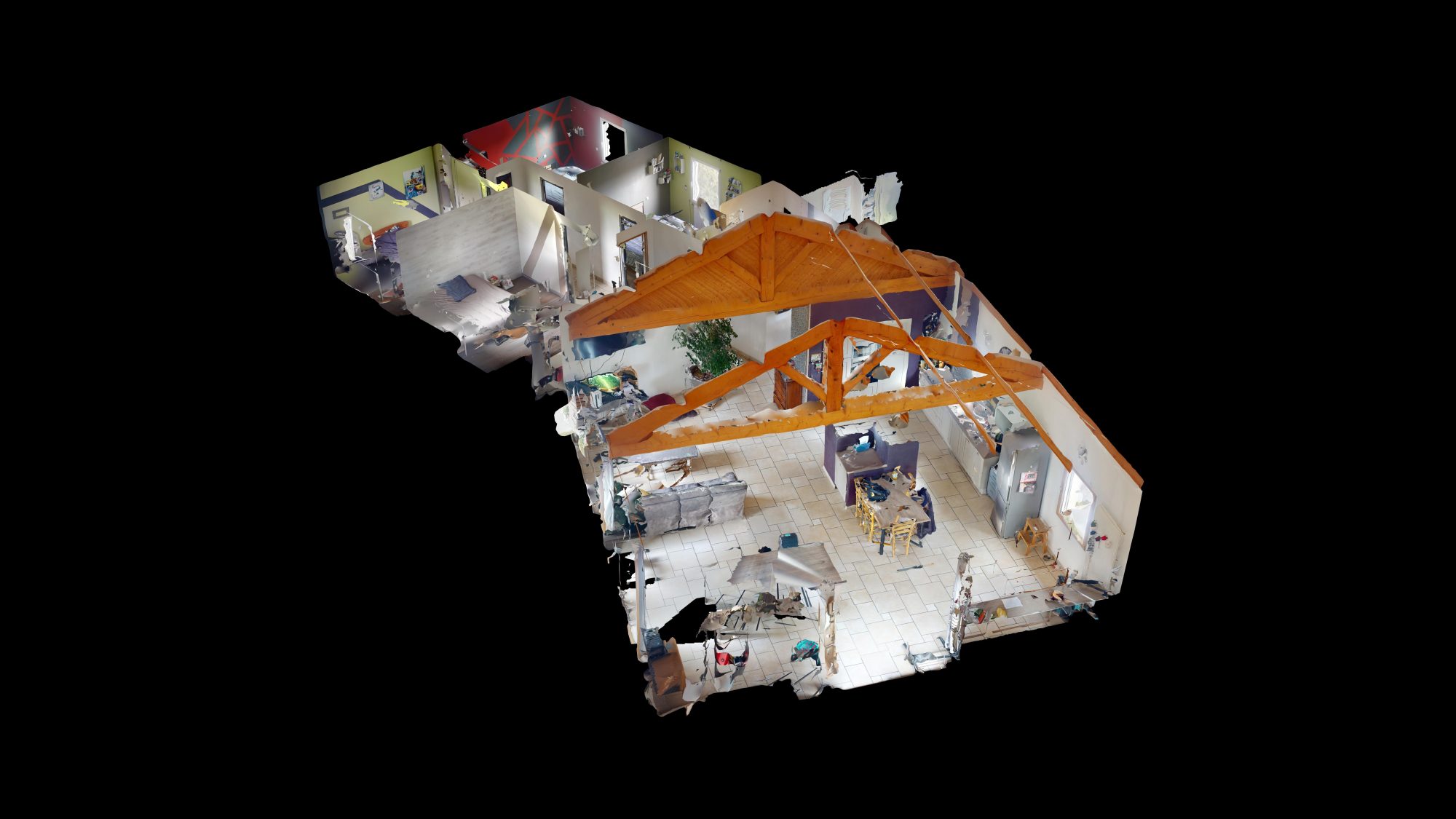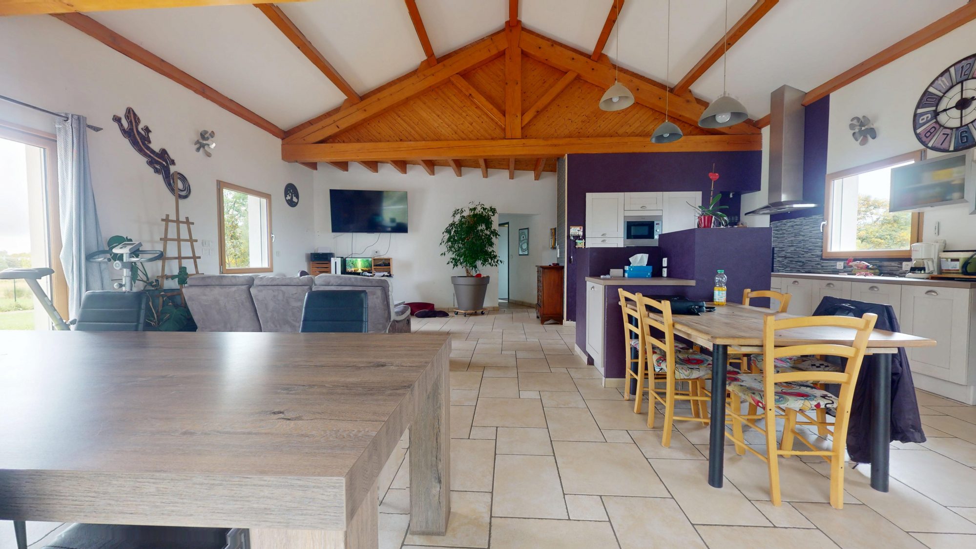 Partie habitable à l'étage d'environ 150 m² avec hall avec placards, cuisine équipée ouverte sur séjour, couloir, salle de bains, wc et 4 chambres.