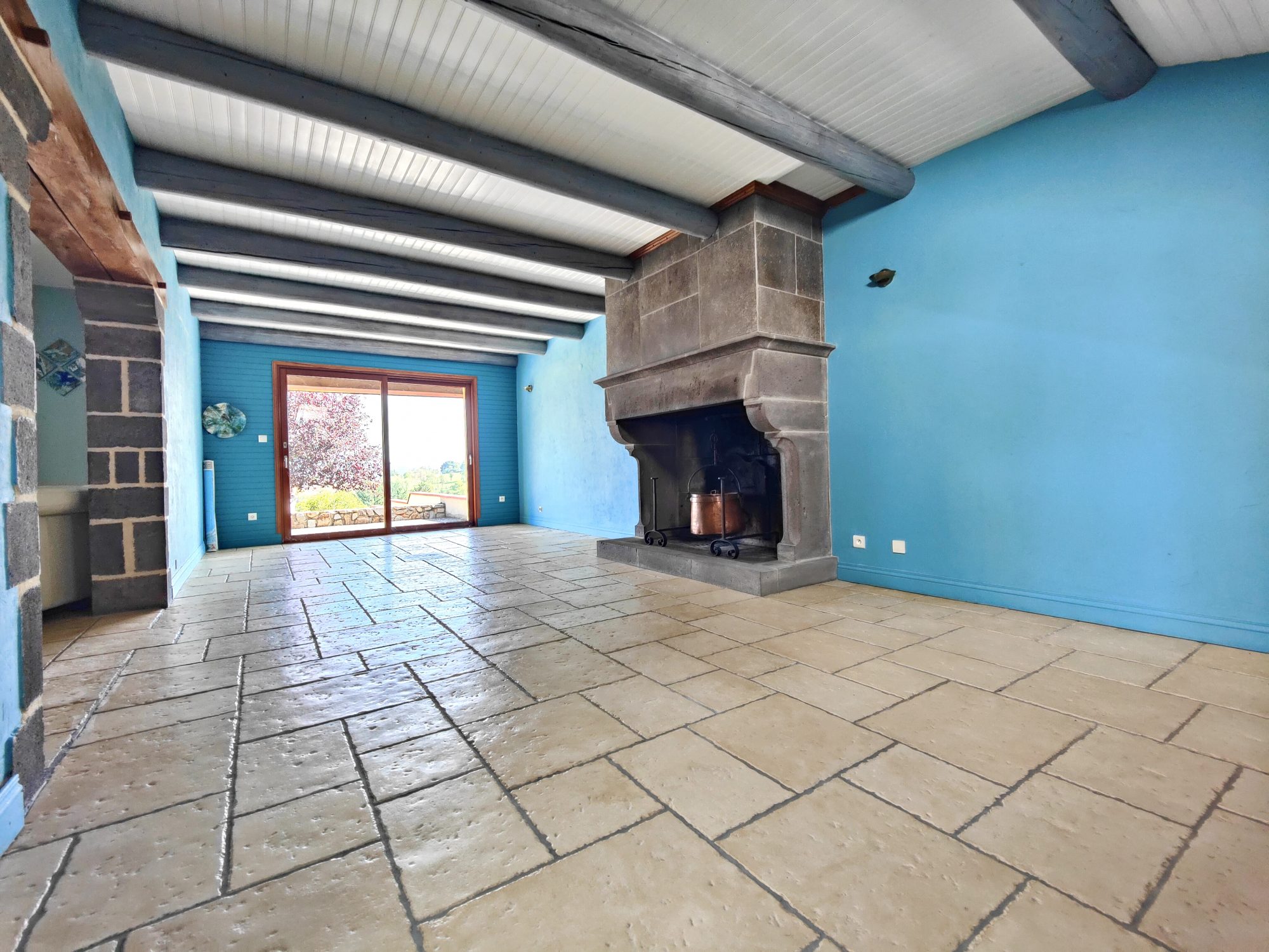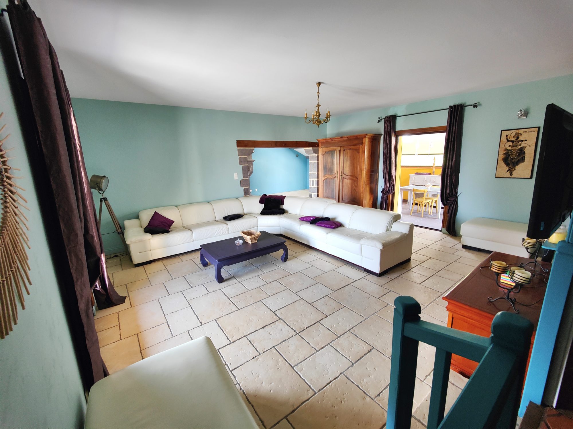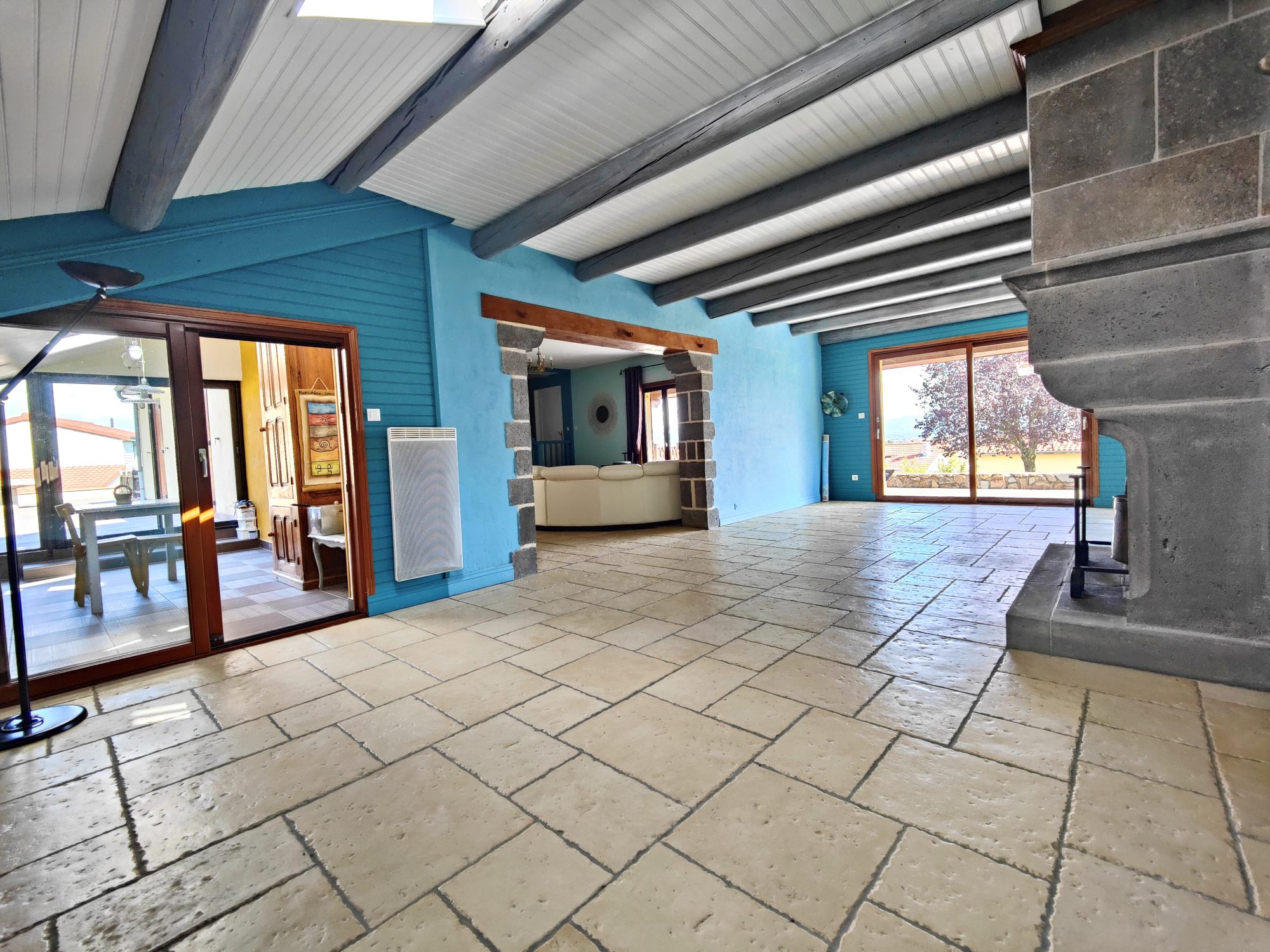 Grâce à cette configuration traversante, l’immense séjour de 66m² reste lumineux quelle que soit l’heure de la journée. La particularité du coin salle à manger de cet espace est une grande cheminée pensée et dessinée par la propriétaire et conçue par un artisan tailleur de pierre, qui amène beaucoup de cachet à la pièce.