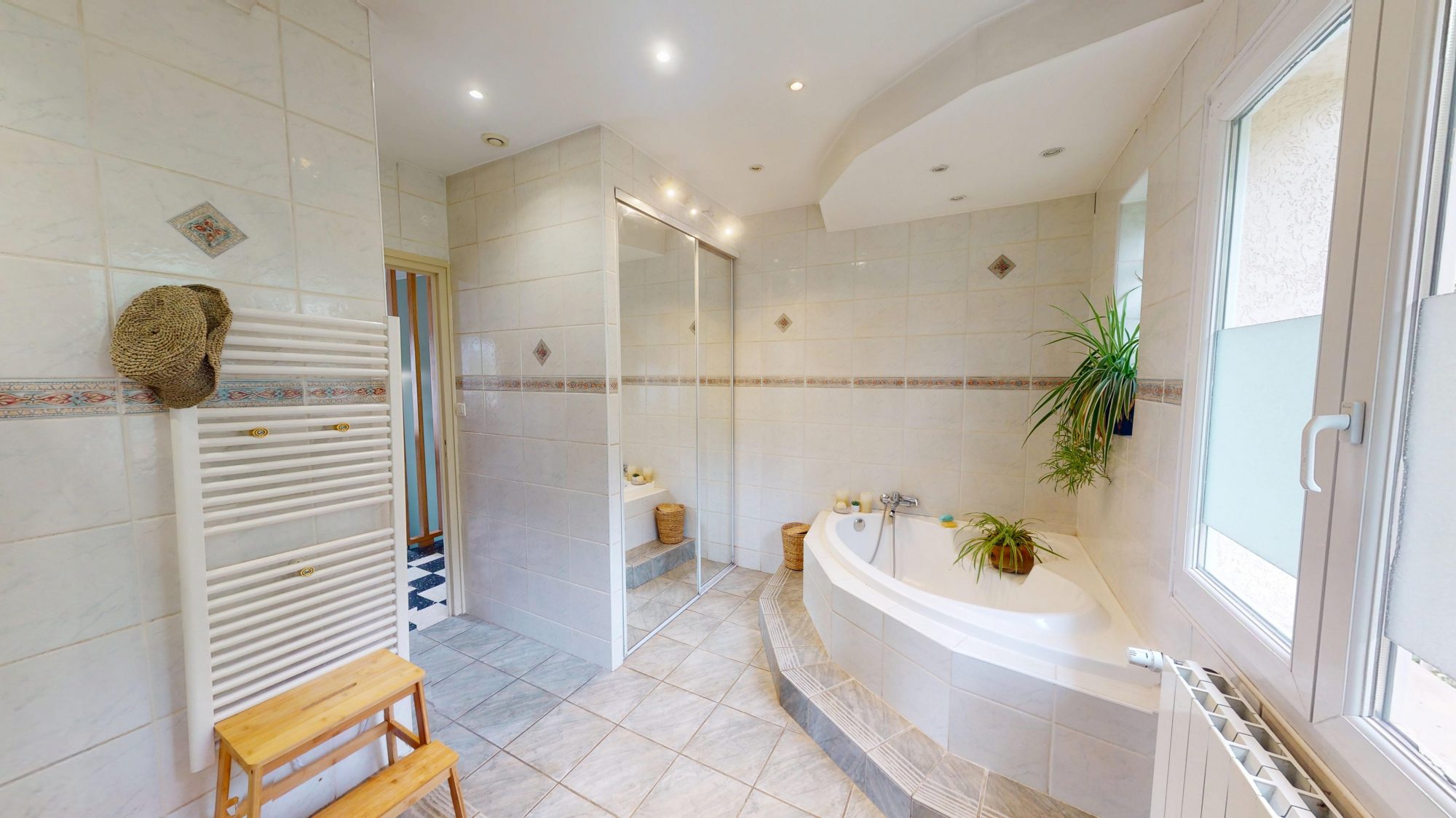 - 1 salle de bain avec douche et baignoire d'angle