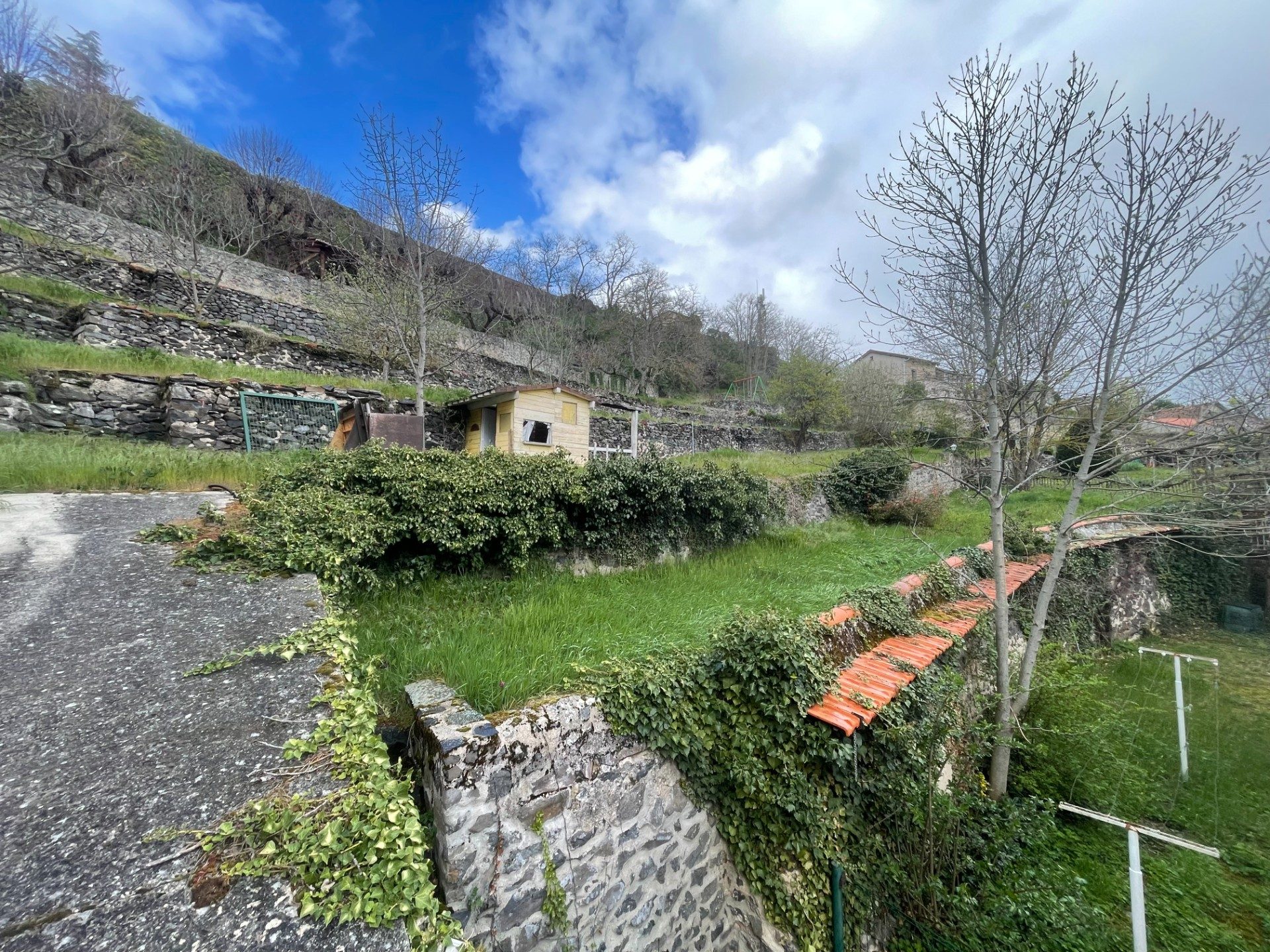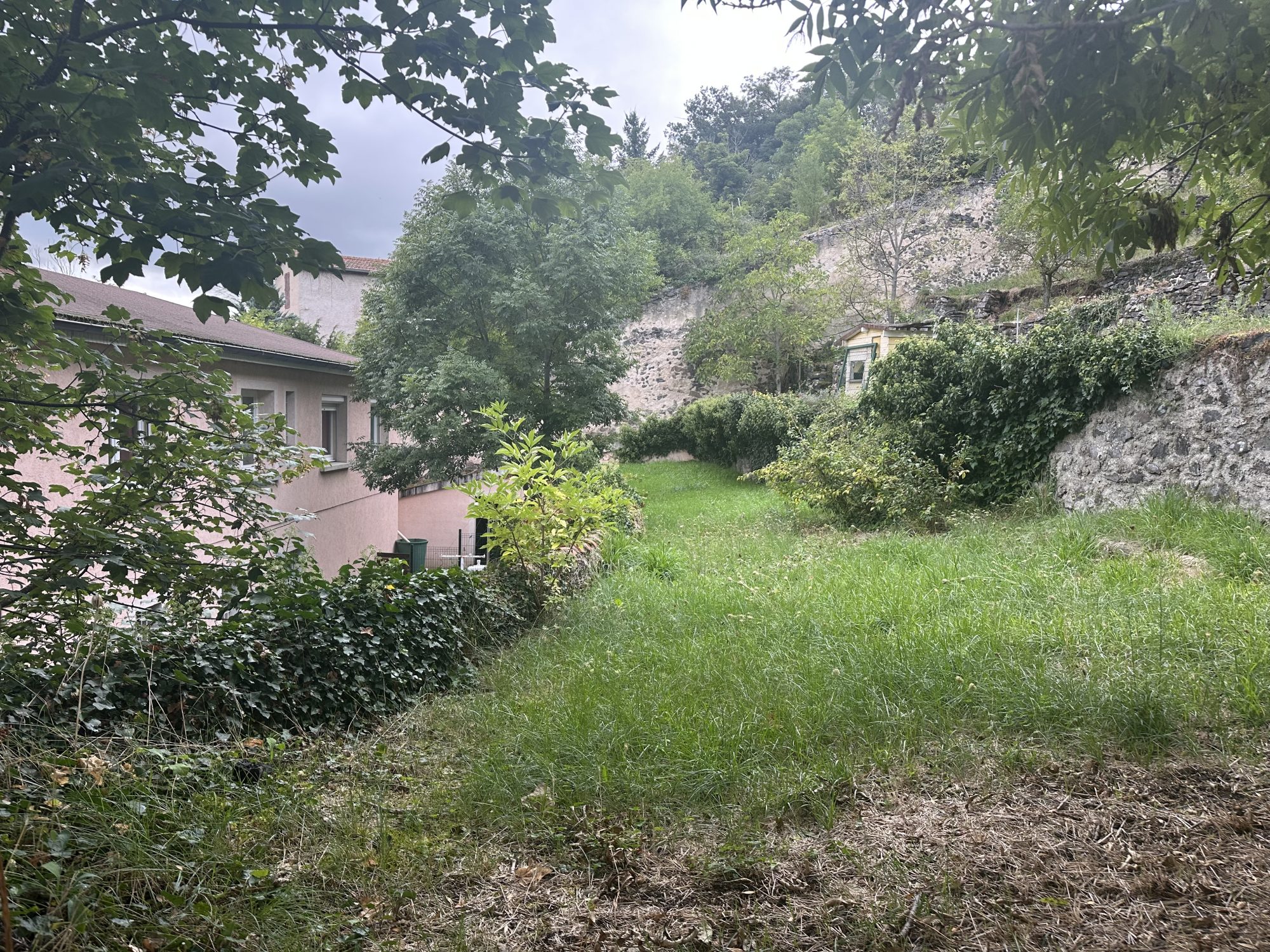 Derrière la bâtisse, les reste du terrain est terrassé en plusieurs paliers offrant des possibilités d'aménagement et une superbe vue dégagée.