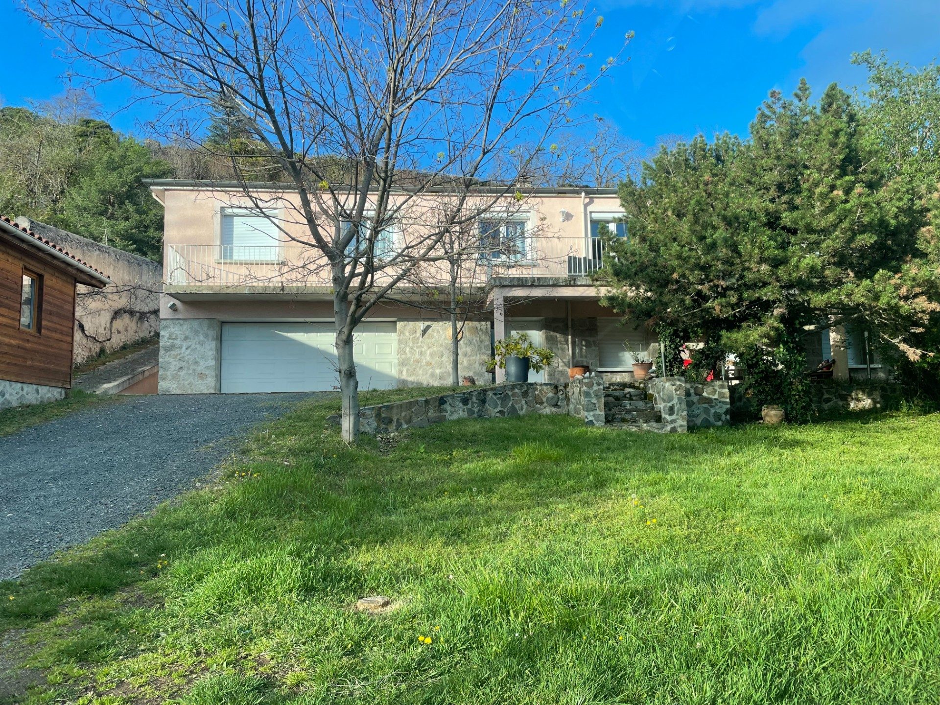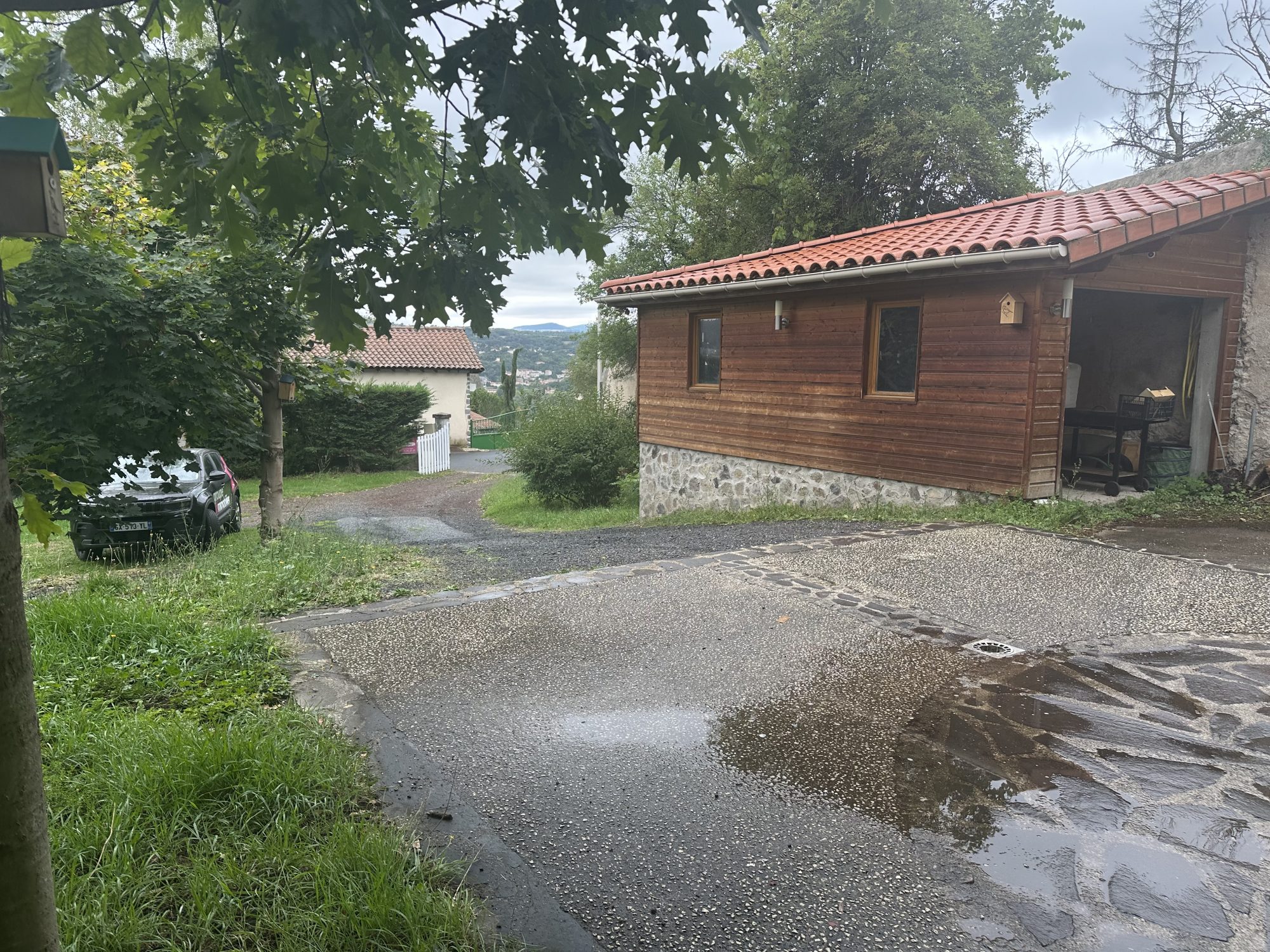 Les 2600m2 de terrain offrent un espace jardin et stationnement spacieux devant la maison.