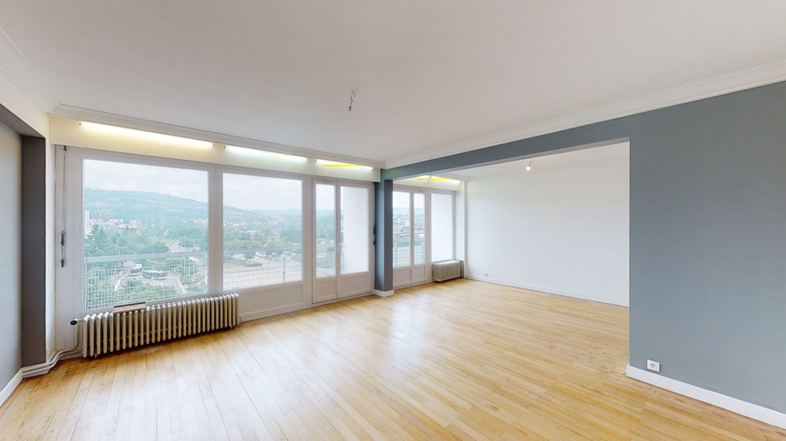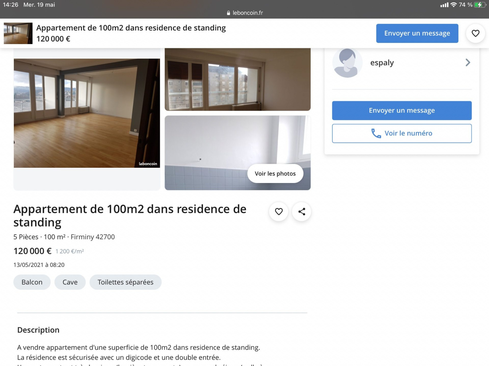 EXCLUSIVITÉ GTI! CENTRE-VILLE DE FIRMINY, APP T5/T6 127m2 env. au 4ème étage avec ascenseur dans résidence calme et sécurisée.Salon/Salle à manger 36m2 env. avec 2 balcons et placards de rangements, cuisine indépendante, 3 grandes chambres avec balcons (20,14 et 12m2), bureau, une salle d?eau, une salle de bain et WC séparé. Chauffage + eau chaude + eau froide collectif, fenêtres PVC DV récentes + VR. Nombreux rangements, cave, traversant, proche toutes commodités, centre-ville. Copropriété calme, sécurisée et bien entretenue. Possibilité de garage(s) en plus.Visite virtuelle disponible.Pour plus d'informations, contactez votre conseiller Vincent-Lucas GONZALEZ au 06.58.79.98.32