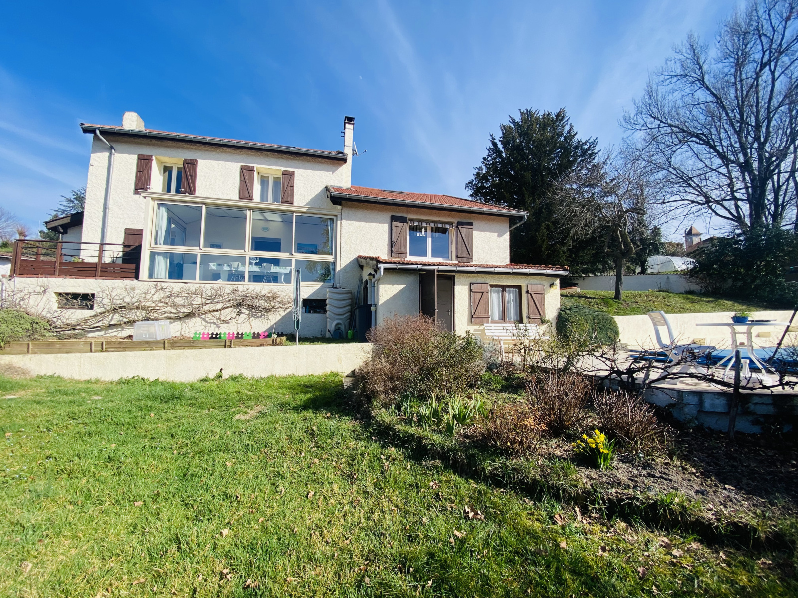 Nichée dans un environnement très calme, maison de 172m2 habitables avec un jardin de 1200m2, très lumineuse. Elle est composée au rdc d'un grand séjour, une cuisine ouverte sur la salle à manger, une chambre et un wc. À l'étage 2 grandes chambres, un bureau, une salle de bains et un wc. A l'extérieur, une piscine avec pool house. Stationnement 1 voiture dans le garage et une cave.