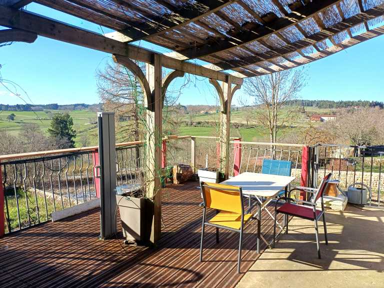 Cette ancienne boucherie transformée et rénovée comprend au niveau principal une entrée desservant un salon très lumineux de 27m² env, une salle d'eau, wc indépendant et une cuisine meublée et équipée avec fourneau bois, donnant sur une grande terrasse bois de 32m² env avec vue sur la campagne.