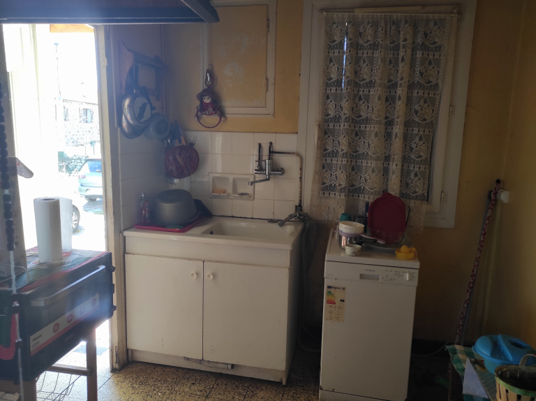 Hall, salle d'eau, wc, cuisine, séjour avec cheminée et 2 chambres.