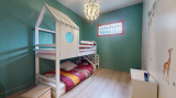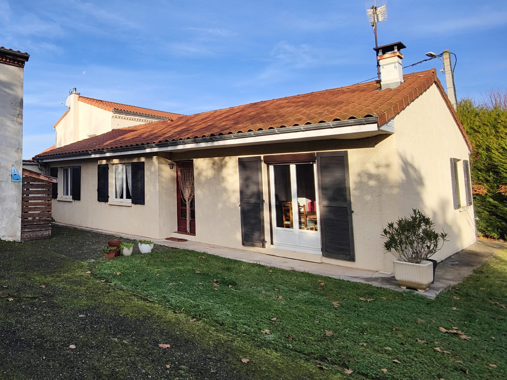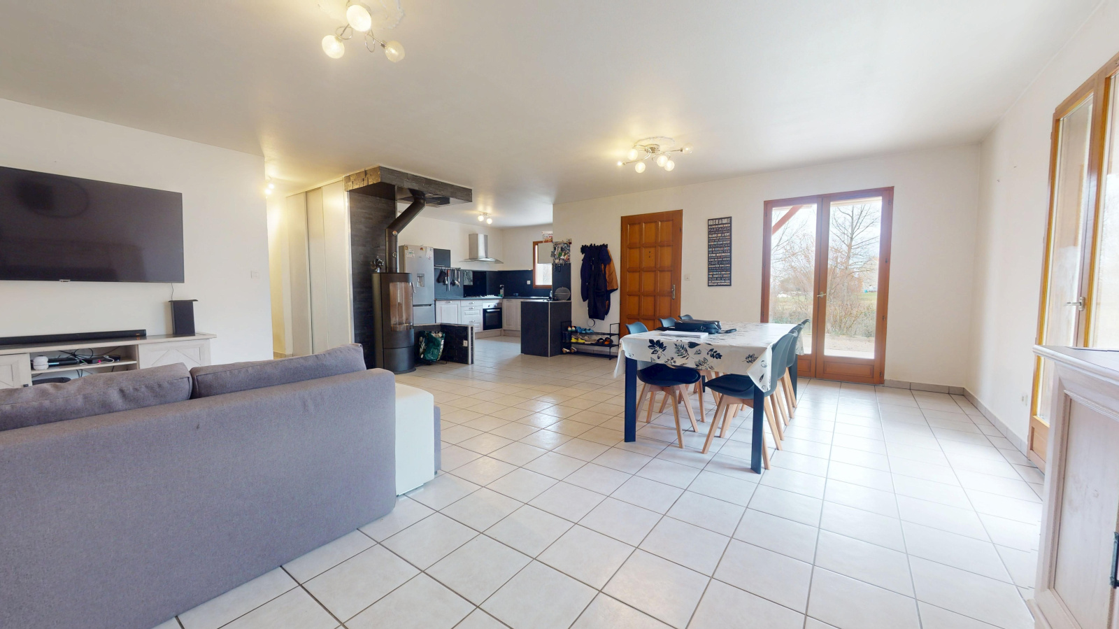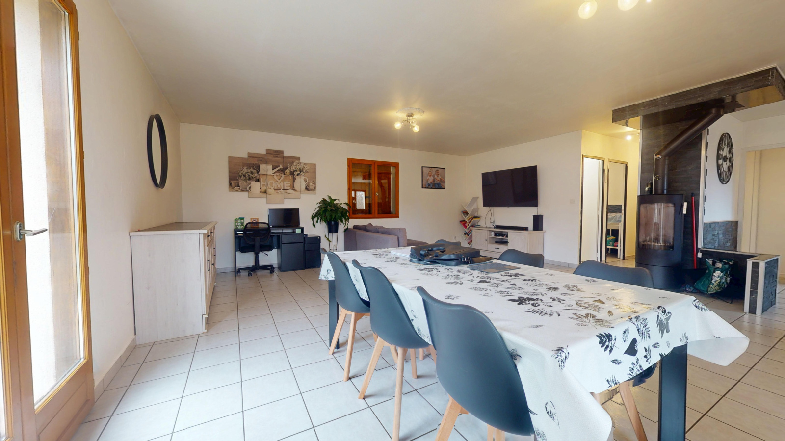 Cuisine équipée ouverte sur séjour avec poele à bois, 3 chambres, salle d'eau et wc.