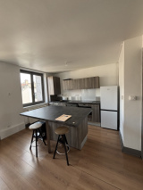 - Une cuisine équipée avec îlot central, ouverte sur le salon