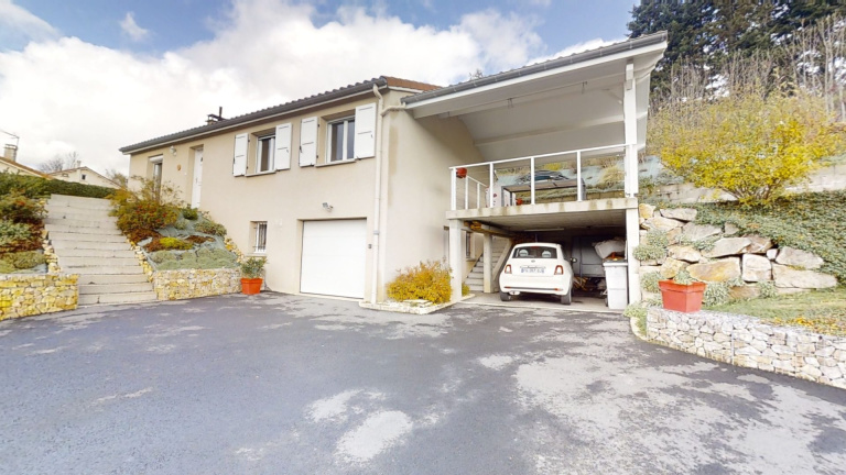 EXCLUSIVITÉ GTI IMMOBILIER ! Découvrez cette charmante villa construite en 2007 sur sous sol complet et terrain d?environ 1 160m2. Au sous-sol une partie garage avec portail motorisé, une pièce chauffée à usage de salle de jeux d?environ 20m2, un WC et une cave. La partie habitation comprend une cuisine ouverte sur une belle pièce de vie avec accès de plain pied sur le jardin, une salle de bain, un WC séparé et trois chambres. Un abris voiture d?environ 25m2 avec avec terrasse couverte au dessus viennent compléter cette maison. Toiture isolée, double vitrage PVC avec volets roulants sur la partie pièce devis, chauffage électrique + poêle à granulés de 2022. Tout à l?égout. Cours goudronnée, portail motorisé récent, terrain clos et arboré ! Cette villa est située dans un lotissement sans aucun vis à vis avec vue dégagée, tranquillité assurée ! Le tout situé à deux pas du centre du village et de toutes les commodités ( boulangerie, boucherie, restaurant, tabac, épicerie, maison de santé ,?) La visite virtuelle est disponible sur notre site : www.gti-immobilier.fr . Pour plus de renseignements contactez Nadège PEYRARD au 06 58 79 86 55.