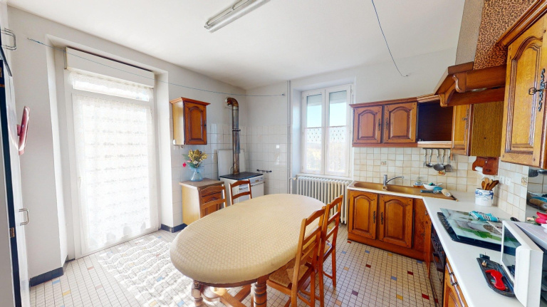 - cuisine, meublée et équipée (four, plaque gaz, hotte, fourneau bois de 2018) 15.1 m²