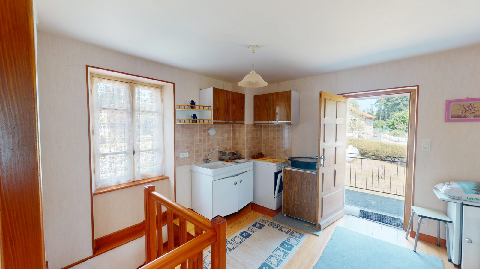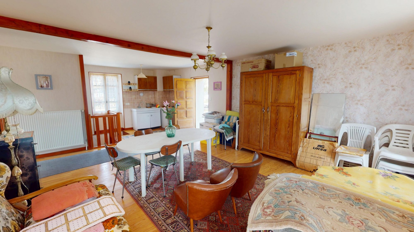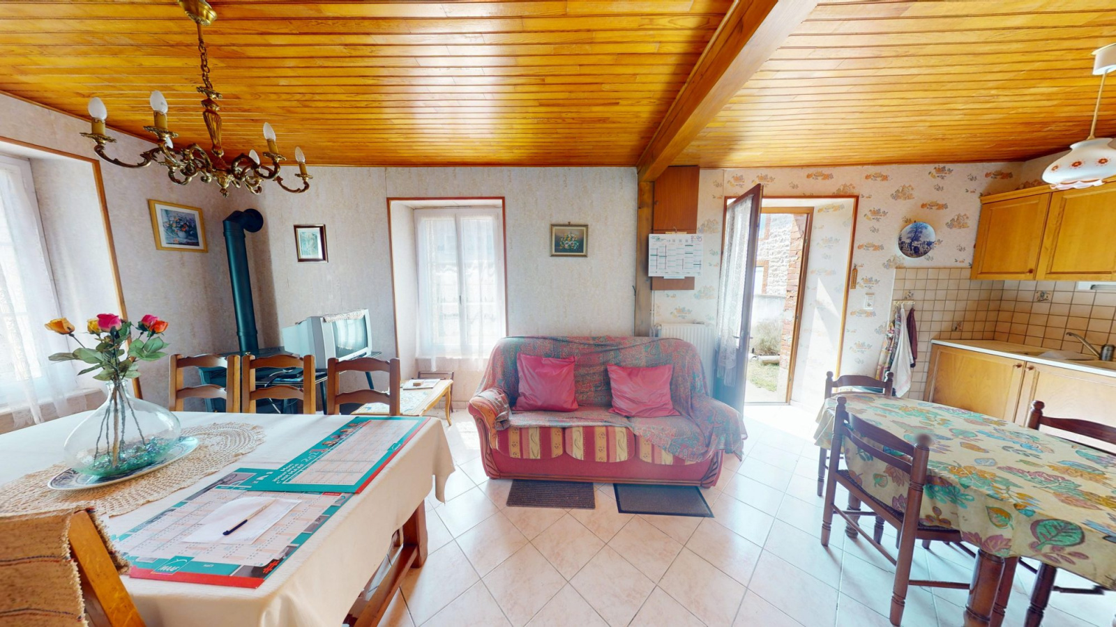 - cuisine meublée (gazinière, four, hotte, frigo, machine à laver)ouverte sur séjour avec poêle à granulés 27.18 m²