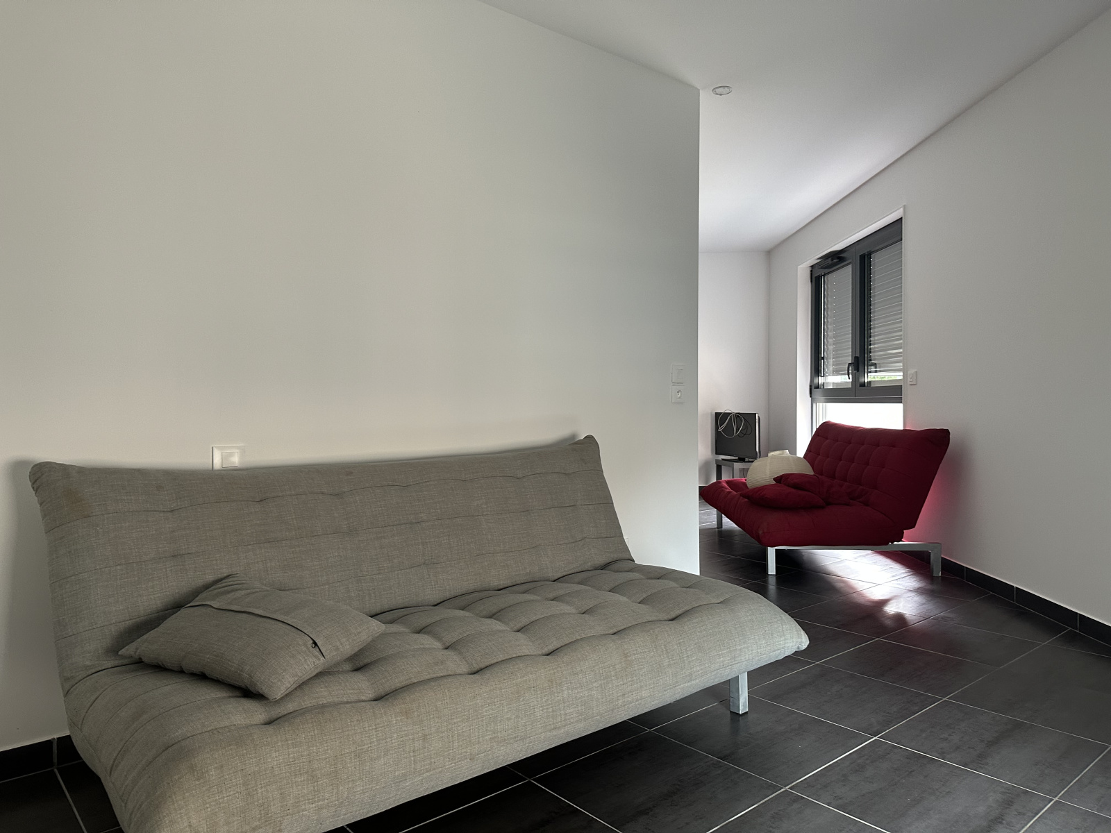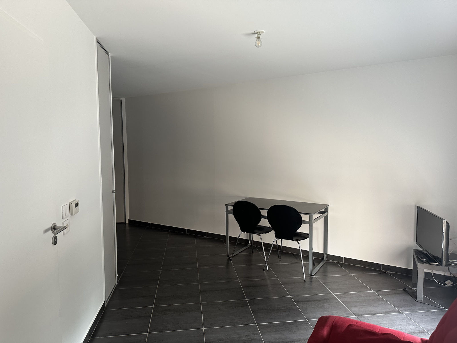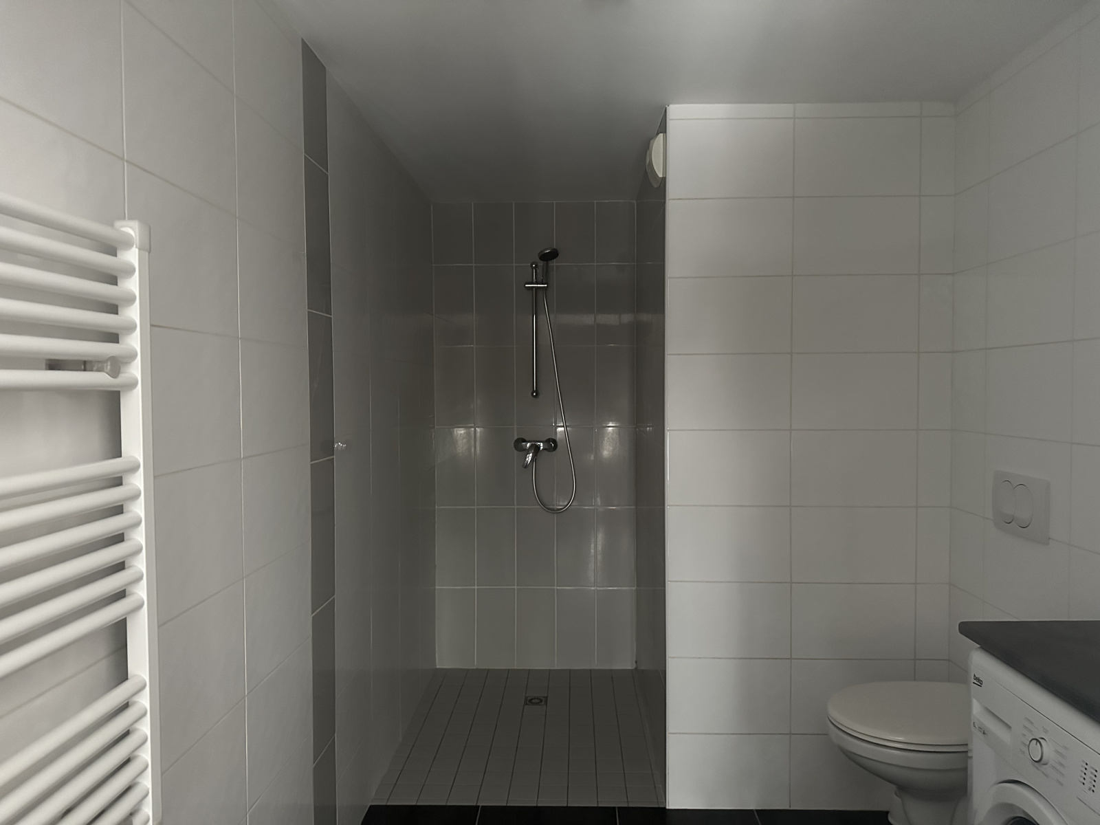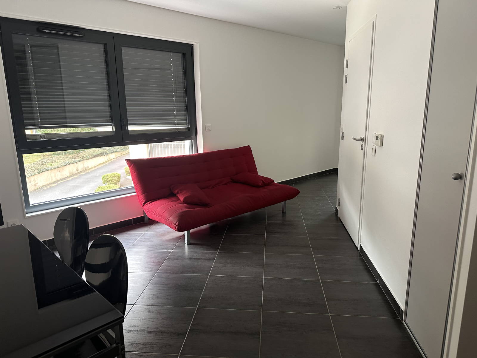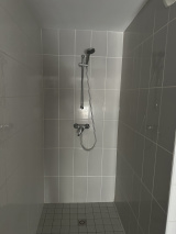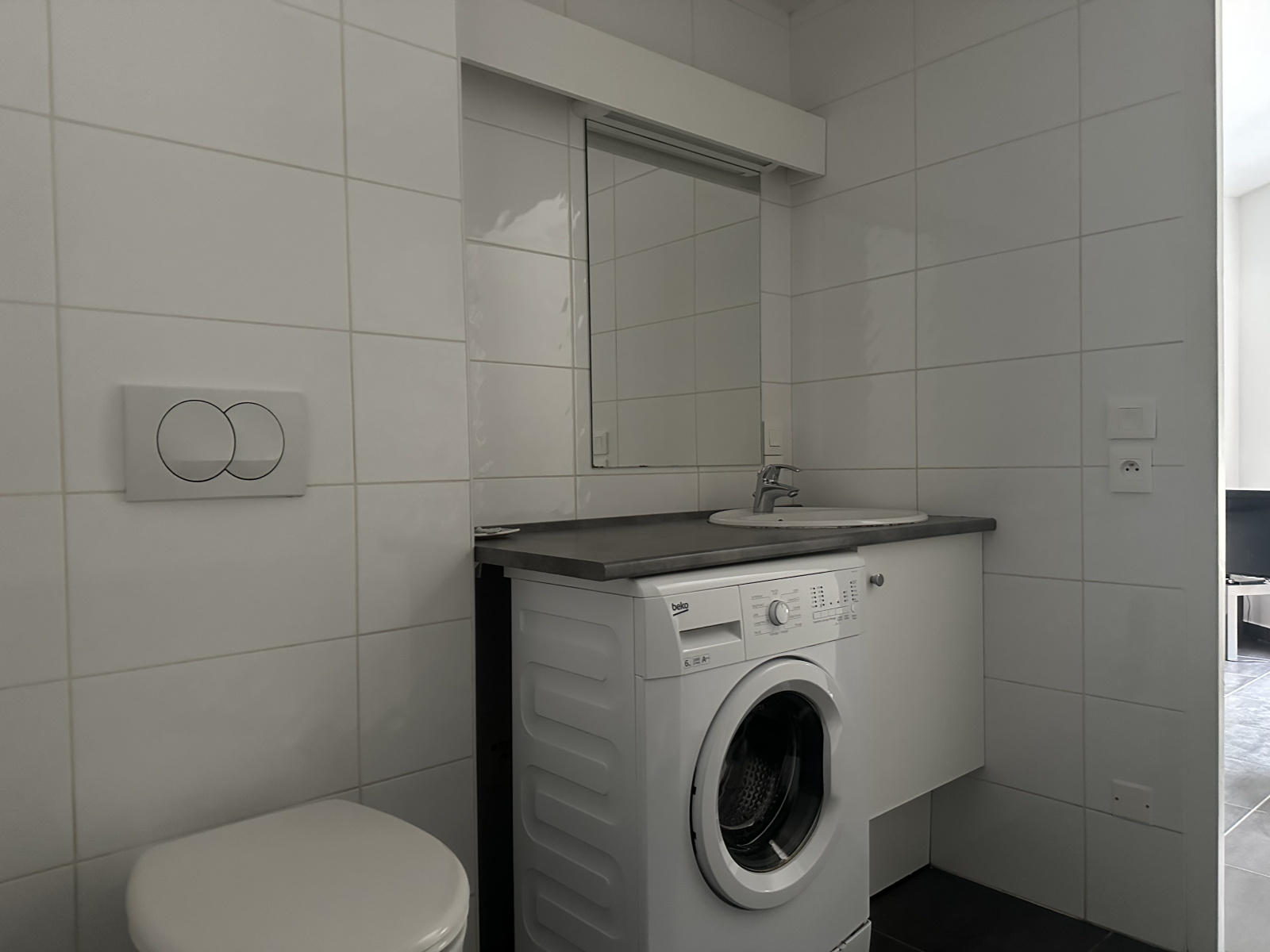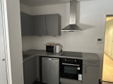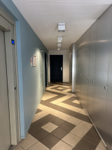 L'appartement au 1er étage avec ascenseur, est conçu avec une belle pièce à vivre avec cuisine ouverte, un coin chambre semi-indépendant et une salle de douche spacieuse (avec coin buanderie).