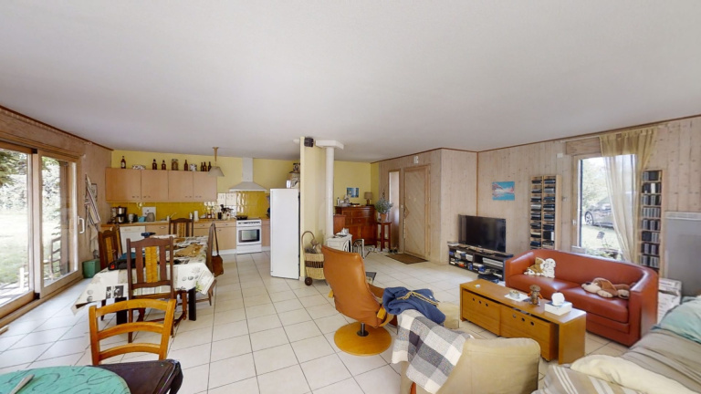 PLAIN-PIED en ossature bois de 2002, d?environ 108m2 et garage double sur un terrain d?environ 2700m2La maison est édifiée dans un un écrin de verdure: d?un côté les arbres fruitiers et de l?autre les arbres d?ornements lui conférant intimité et particularité. De manière plus classique, le bien se compose d?une cuisine ouverte sur le séjour pour une surface totale de 55m2, une salle d?eau, buanderie, et 2 chambres.La maison est équipée de plusieurs systèmes de Chauffage: PAC air/air, radiateur électrique et poêle à bois.Actuellement, l?assainissement est individuel mais il y a la possibilité de se relier à l ?assainissement collectif.Visite virtuelle disponible sur notre site internet Pour plus de renseignements contacter Céline Héritier 0698484278